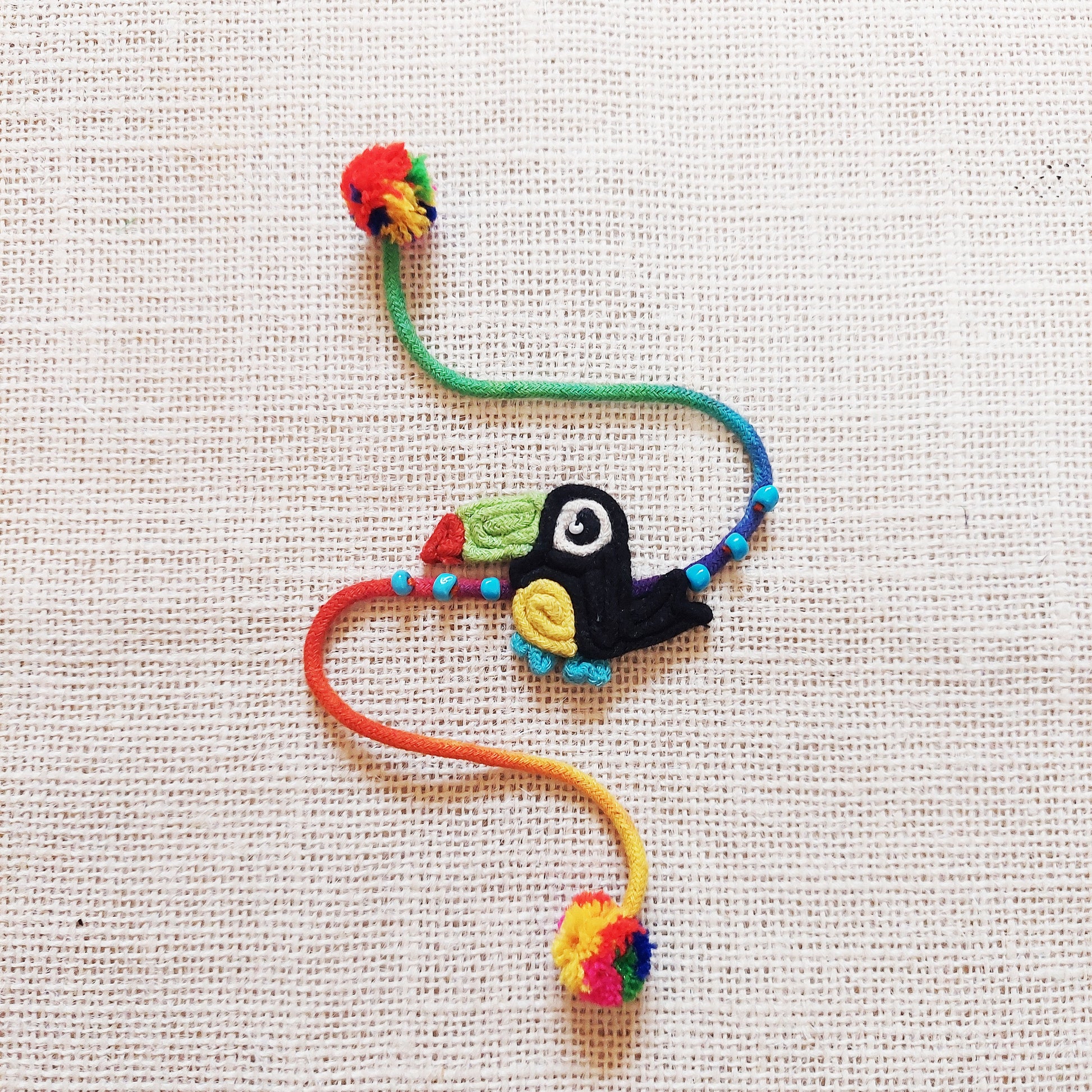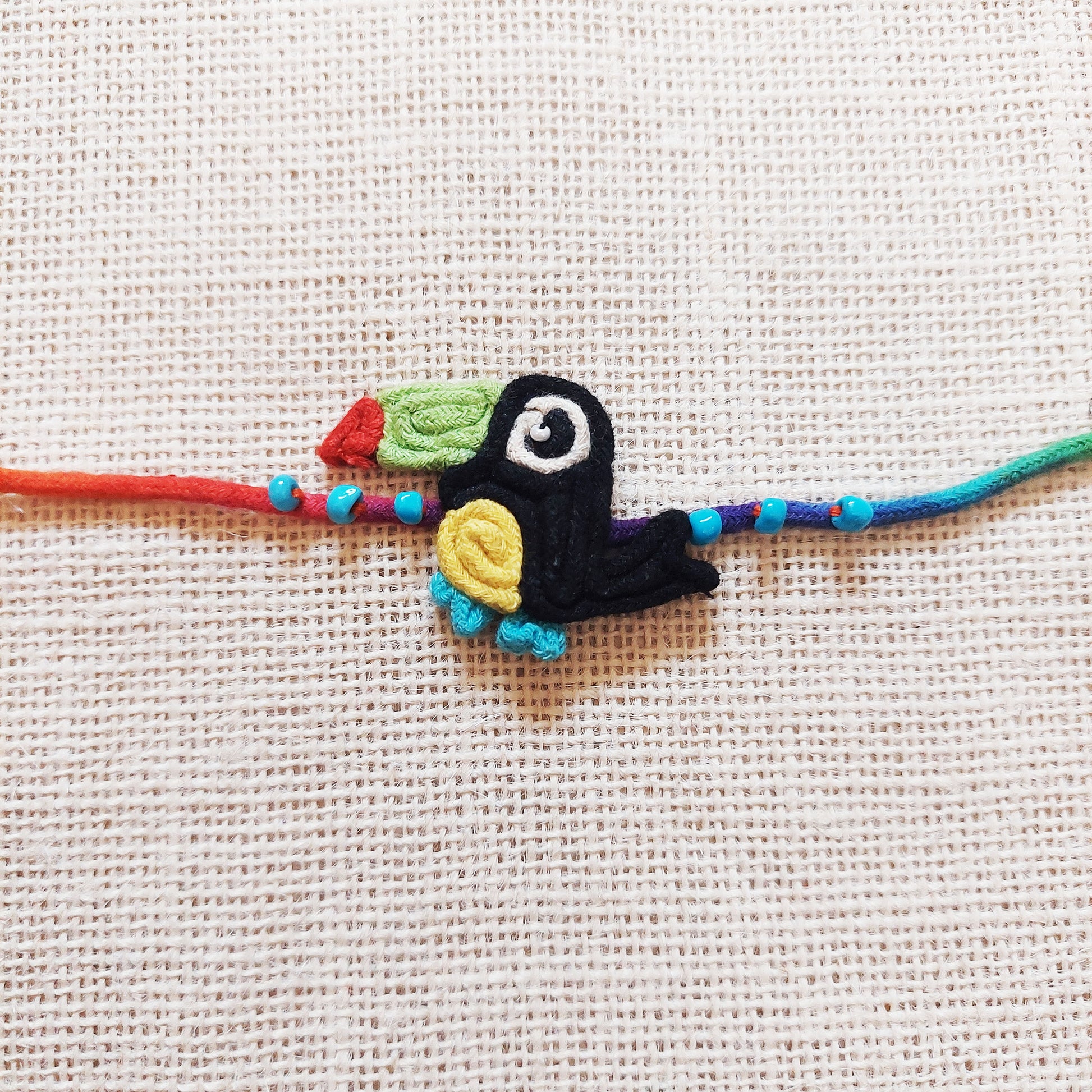 Handmade Rakhi for your little brother. This one has a Toucan created in our signature Dori Work and embellished with Ceramic beads and pompoms. Very Adorable Rakhi to celebrate this Special bond.