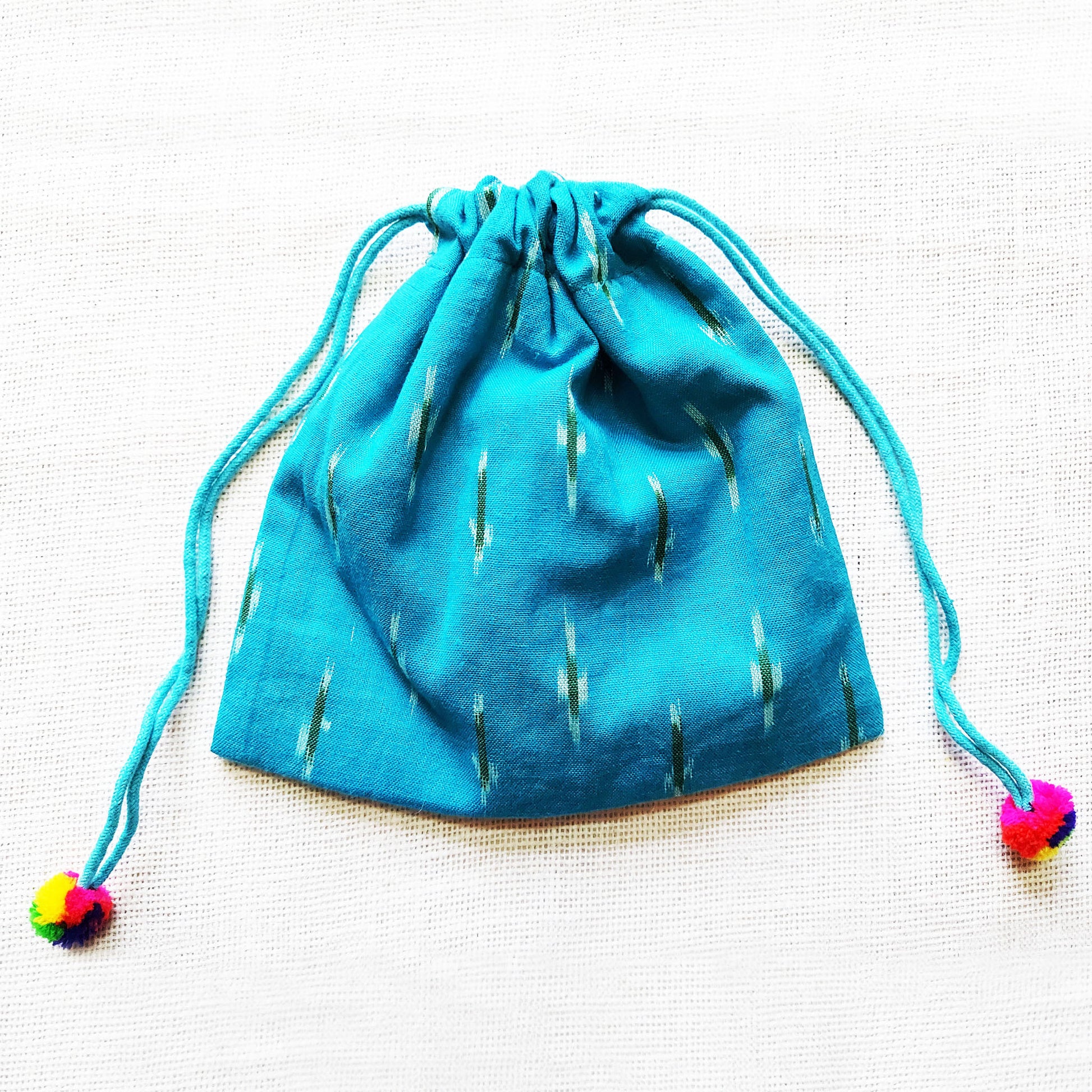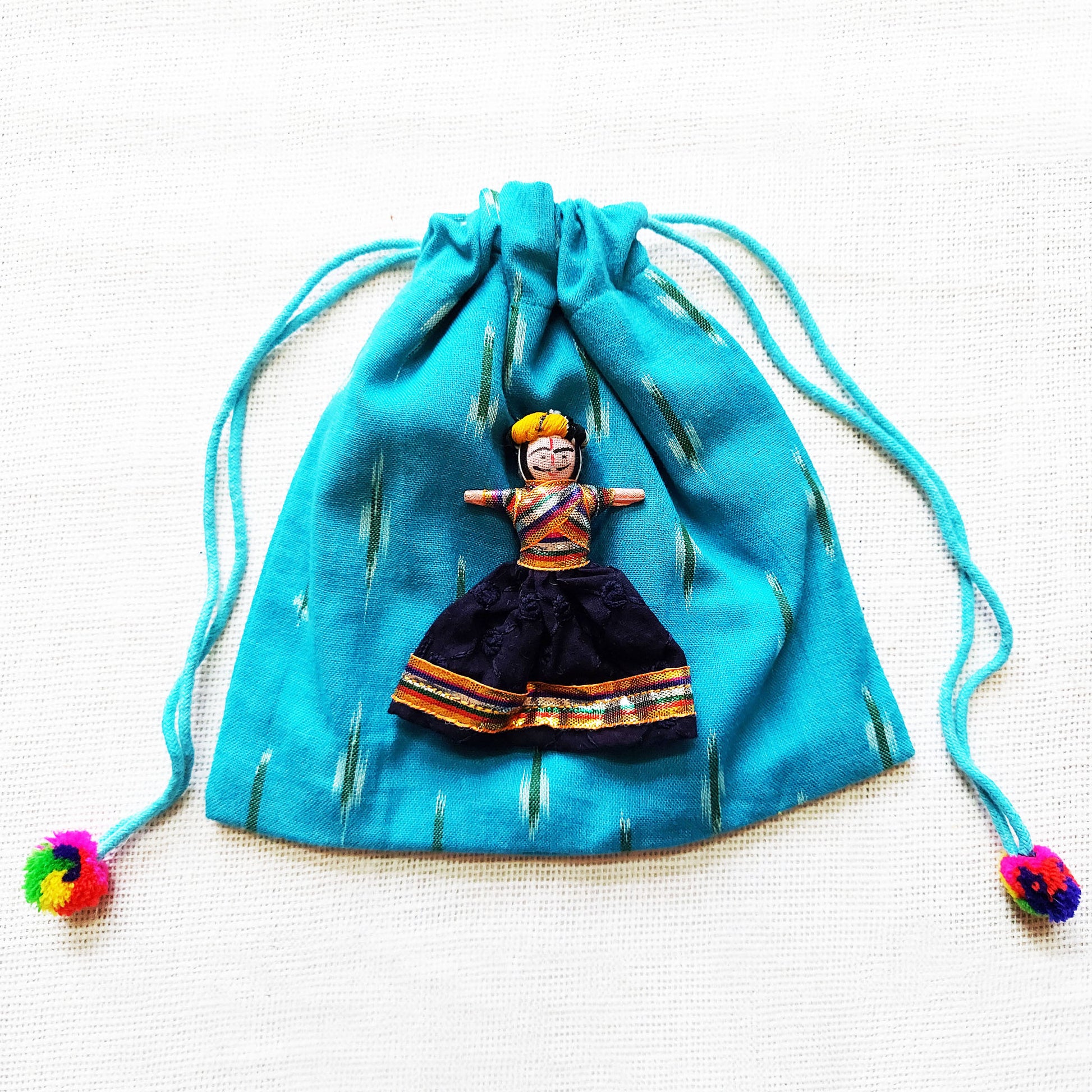 These vibrant, Ikat potlis are sure to add zing to any outfit. The beautiful, handmade puppet that adorns this potli is sure to snag attention. What's more, the drawstring closure ensures that all your essentials stay safe and sound. Perfect for a day out with friends or a special evening event, these potlis are sure to make a statement.
