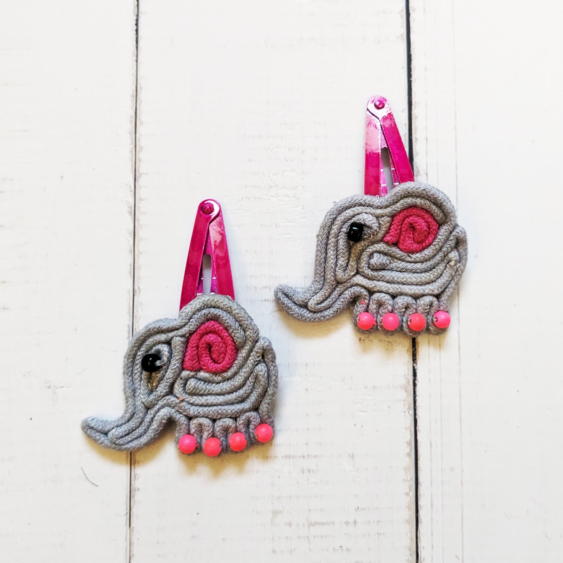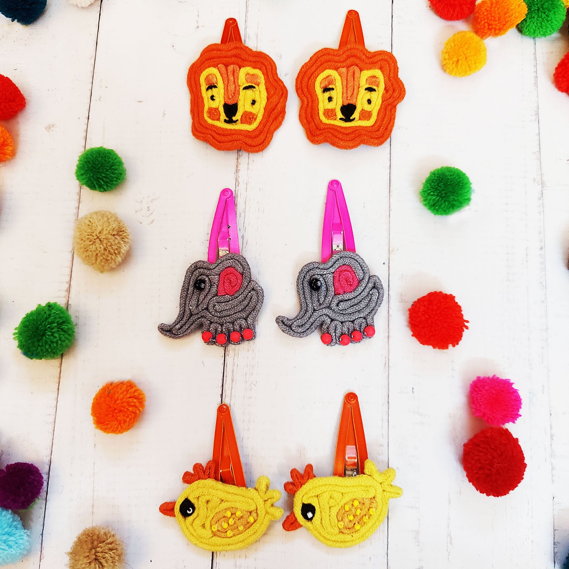 This set of 3 hair clips is made out of cotton Dori. There is one pair of lion clips, one pair of elephant clips and one pair of chick clips. These are handcrafted and adorable.