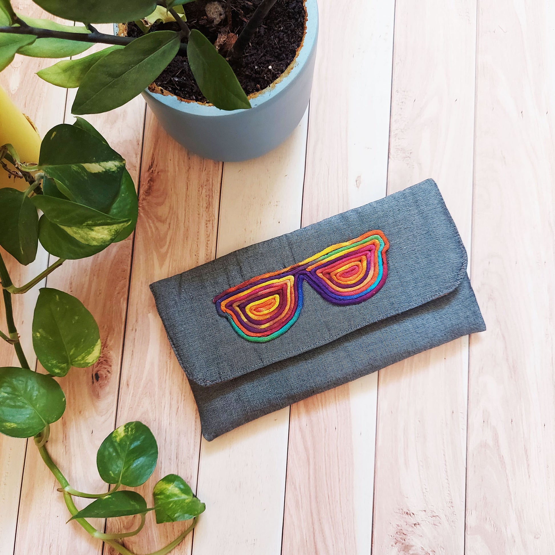 A Denim Eyewear Case with a hand embroidered pair of multicolor Wayfarer sunglasses patched onto it. A sturdy cover to hold your glasses or sunglasses. It has a magnetic closure and layers of foam to keep your glasses protected. So keep your sunnies or your glasses in this and never worry about losing them again.
