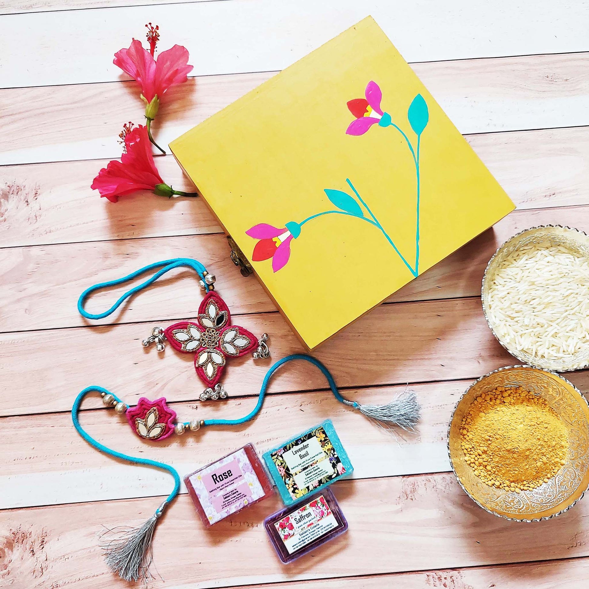 A hand painted Floral box with a Mirrorwork Rakhi Lumba set and 3 soaps