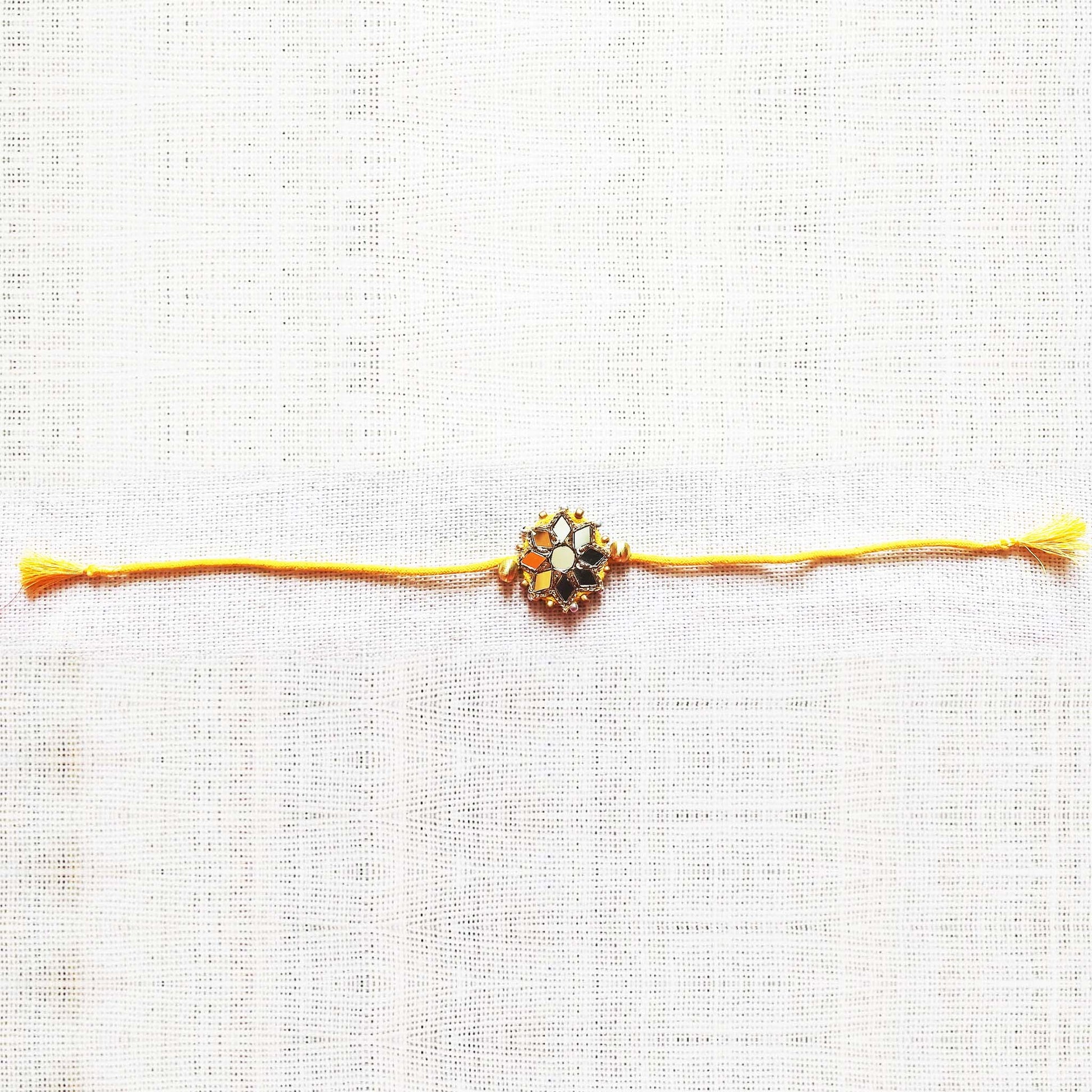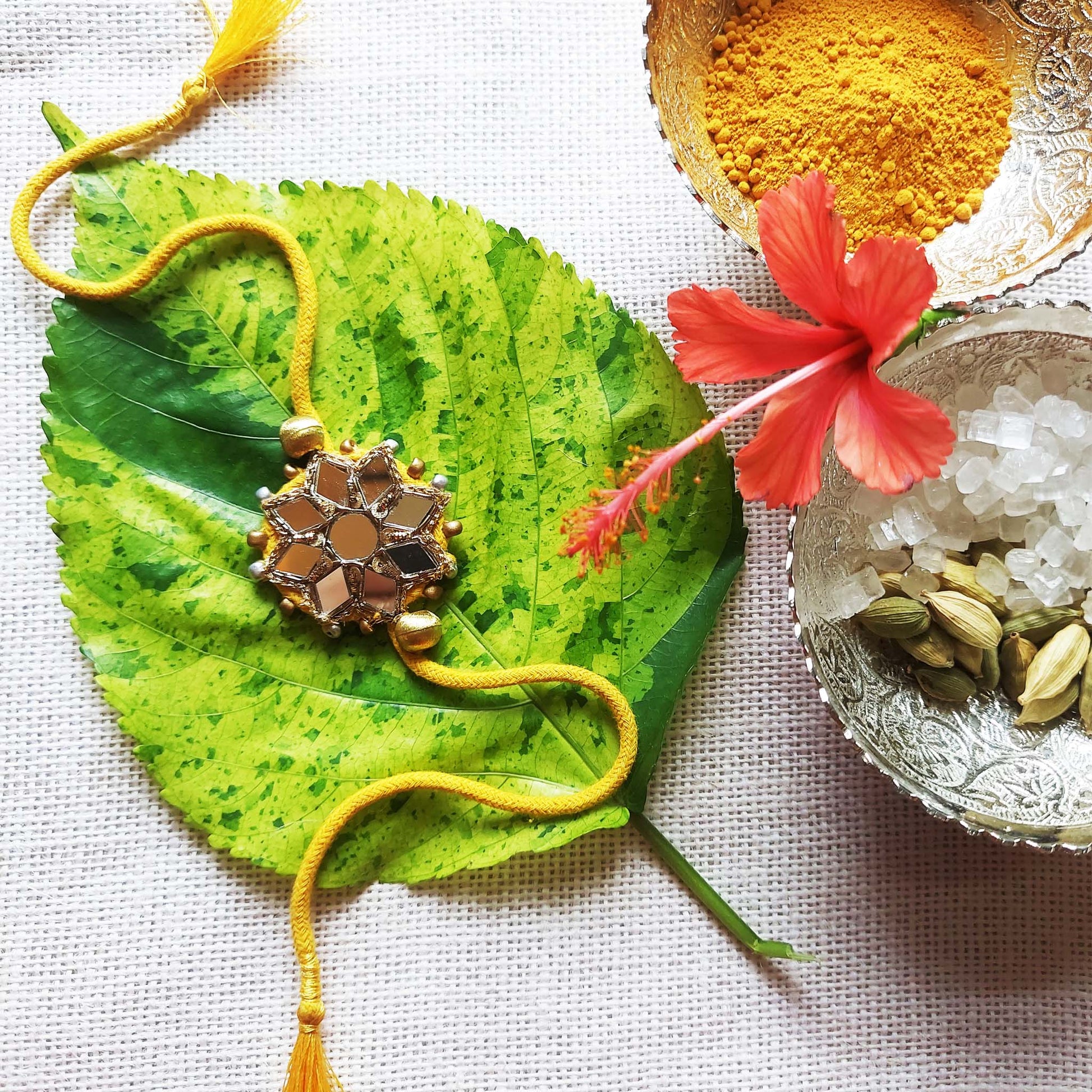 Sitara Rakhi made using age old technique of mirrorwork, adorned with beads and pompoms. A truly Royal Rakhi.